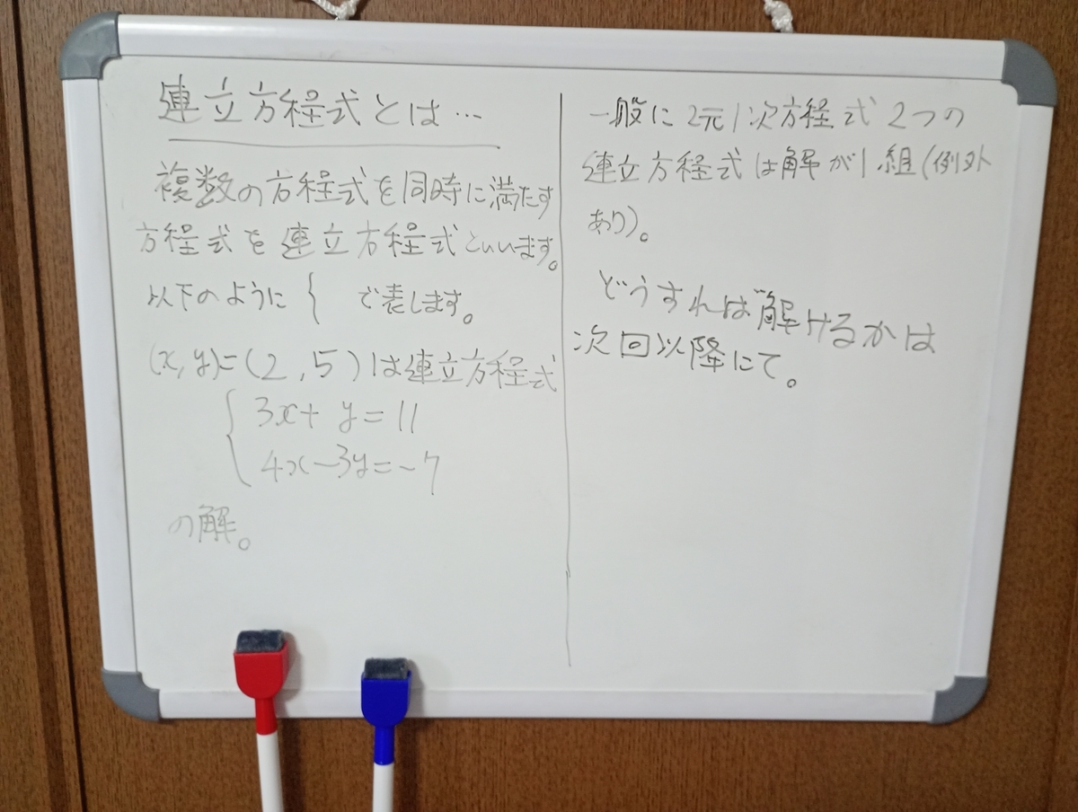 連立方程式は同時に満たす式を { を用いて表します(写真参照)が、ブログ上では表すのが難しいので、「かつ」を表す「&」で代用しています。
